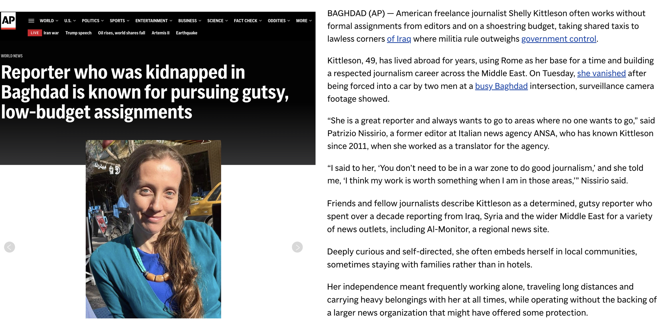"Reporters are heroes of our time", for without them we would not know truth and without truth there is no informed democracy. Reading about Shelly Kittleson is a humbling experience as we realize just how much some of our fellow humans are willing to risk to keep us informed.