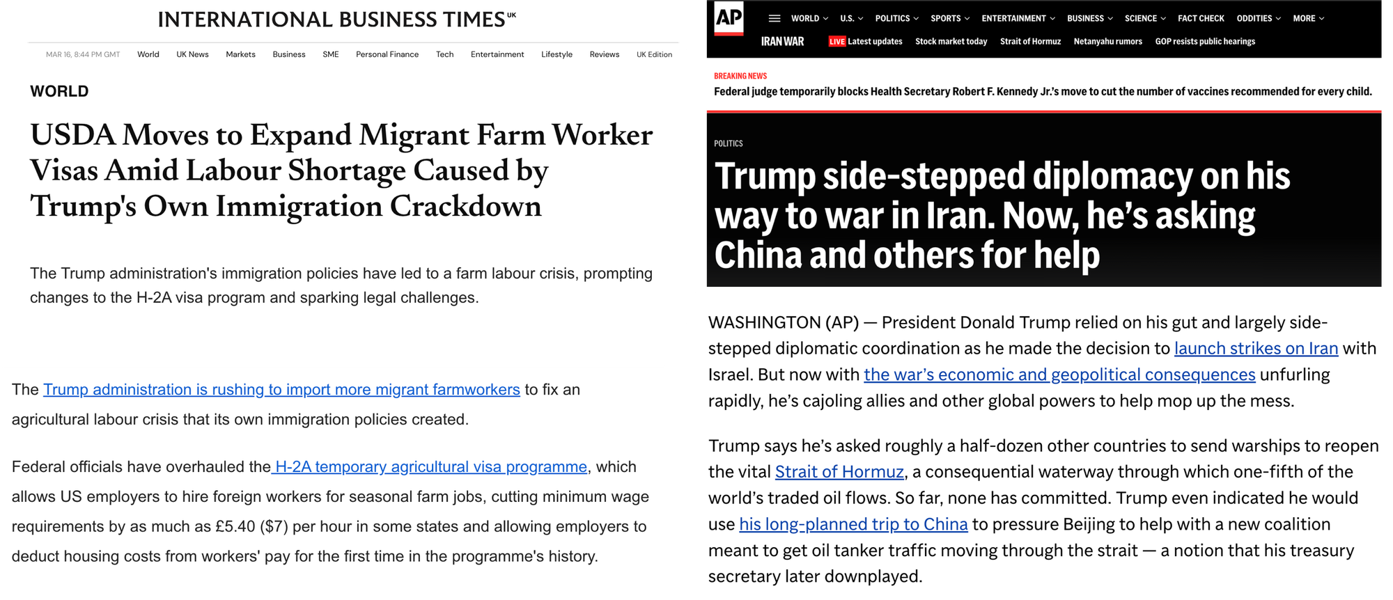 Whether it is creating a new Migrant Farm Worker program that is absolutely evil, but is meant to counter the dumb-ass and inhuman policy he has been enforcing on immigrants or it is asking other countries to clean up his mess in Iran, he is constantly showing that every thing he does is shortsighted and destructive.